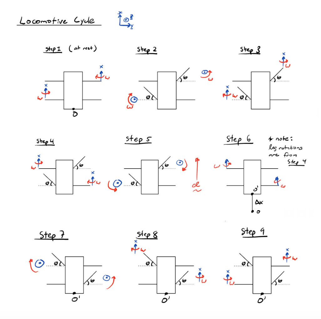 With the 55g servos, the last step remaining was to confirm that the supplied servo torque would be enough to drag the robot forward as seen in the robot locomotive cycle (see figure 6). For this, we performed a basic force analysis on the joints of the robot: