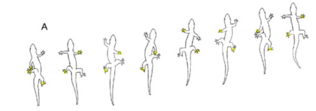 With resting servo forces calculated and silicone pad form factors decided, we moved on to creating the locomotive cycle of the robot that would then be implemented using the on board Arduino and a PWM servo controller. Each foot servo was used to lift feet off the ground and make ground contact, and the leg servos were used to swing the robot back and forth. Our locomotive cycle was based on the diagonal gait used by many researchers, which uses two diagonal legs to support the robot's body as it moves. In this gait, two diagonal legs extend forward and then pull the robot back, and by oscillating between the right diagonal and left diagonal legs, the robot lopes its way forward. This gait is inherently unstable because of the constant shift in CG due to the extension of only two legs at a time. Gecko's- and other industrial robots- overcome this CG shift by using CG correcting appendages like tails, and by fluidly twisting the torso to maintain CG along the path, as seen in the figures below.