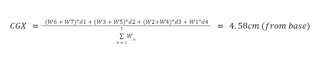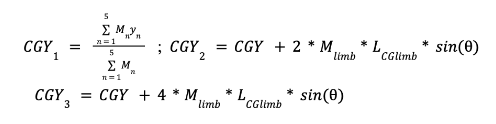 We decided to slightly modify the diagonal gait by extending and pulling back all four legs of the robot at the same time, which would ensure that our CG did not shift away from our desired path. To confirm the stability of this gait we began by analyzing the CG shift and force on CG during regular motion. Assuming a limb length of L, and individual limb weights assigned sequentially, we see that in the neutral position, the Y coordinate of the CG can be found as: