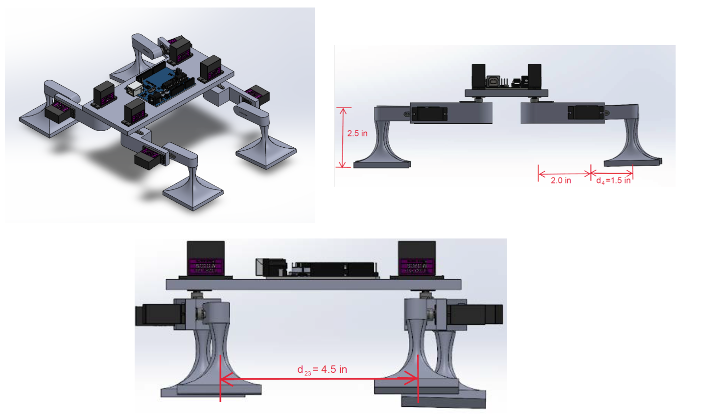With all our calculations done, we created our first design iteration, which is shown in Figure 7. Taking the static force analysis conducted above into consideration, we connected the robot’s legs to the underside of its body to minimize the distance between its center of mass and the climbing surface. We also connected the servo for controlling the attachment/detachment of the foot closer to the foot so that less torque would need to be delivered to carry out this movement. The dimensions of the body were 7 inches long and 3 inches wide. The height of the robot’s legs, d1, was 2.5 inches and the length of each leg, d5, was 3.5 inches. The distance between the front and back legs, d23, was 4.5 inches.