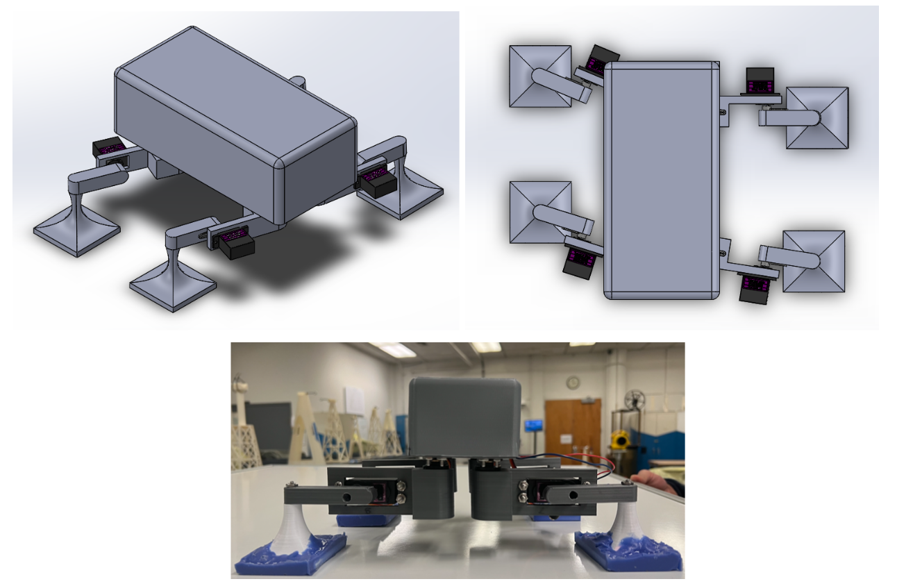 We began the project by designing a locomoting robot that could emulate the gecko’s locomotive climbing cycle and avoid pitch-back as it climbs up a wall. The robot would have four legs, and each leg had two degrees of freedom to replicate a gecko’s limb. One degree of freedom allowed abduction and adduction of each leg for the robot to move forward and lift itself up the surface. The other degree of freedom provided flexion and extension of each leg allowing the robot to adhere to and peel away from the wall. We chose to use eight servos to drive these movements because of their ability to precisely control the rotation of their motor shaft. The maximum mass of the robot would be 0.7 kg (W ~ 7N). The body and legs were made out of PLA to minimize the robot’s weight.