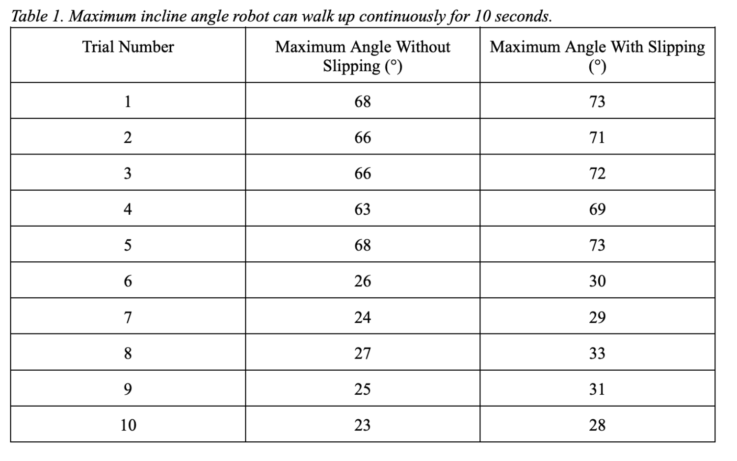 Tests were conducted on an inclined, clean white board. We initially took tests with the robot at rest and with all four of its feet on the white board to ensure the pads were sticky enough to adhere to inclined surfaces. It was determined that the robot could adhere to the white board at an average angle of 71.3°. After these initial tests, we conducted a series of five tests to find the maximum incline angle the robot could climb up without slipping and with slipping. The first five tests were conducted on Monday, November 28th and the last five tests were conducted on Tuesday, November 29th. We conducted these tests by placing the robot at the bottom of the whiteboard and letting it walk up the board for 10 seconds. We increased the incline angle by about 2 degrees until its maximum incline angle was reached.
