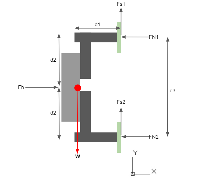 Since the robot is symmetric about the X axis, the Y coordinate of the CG can be found using CAD at 9cm from the back foot base. Thus, knowing the location of the CG in neutral position, we can label the minimum required adhesion and normal forces while the robot is in the "resting" position- all legs neutral, feet against a vertical surface. Seeing Fig [3], d1 is the distance between the robot’s center of mass and the wall, d2 is the distance between the CG and the middle of the first foot, and d3 is the distance between the centers of the two feet. Once again, only half of the robot weight is considered due to symmetry. Considering the robot to be in equilibrium at this moment, we find:
